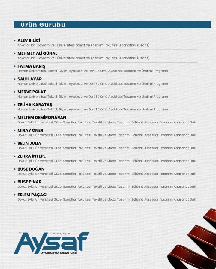 AYSAF (Ayakkabı Yan Sanayi Fuarı) içerisinde düzenlenecek olan "Tasarlıyoruz Dericesine" seçkisi için başvuran tüm adaylara teşekkür ederiz. Başvurular arasından her bir çalışma alanında uzman akademik ve sektörel jüri tarafından titizlikle incelendi ve büyük bir özenle değerlendirildi. Seçilen tüm tasarımlar, yenilikçi yaklaşımları ve özgün detaylarıyla jüri üyelerimizden tam not aldı. Katılan tüm adaylara gelecek projelerinde başarılar diler, aşağıdaki tasarımcıların çalışmalarını @aysafexpo 'da sergilemekten mutluluk duyarız.